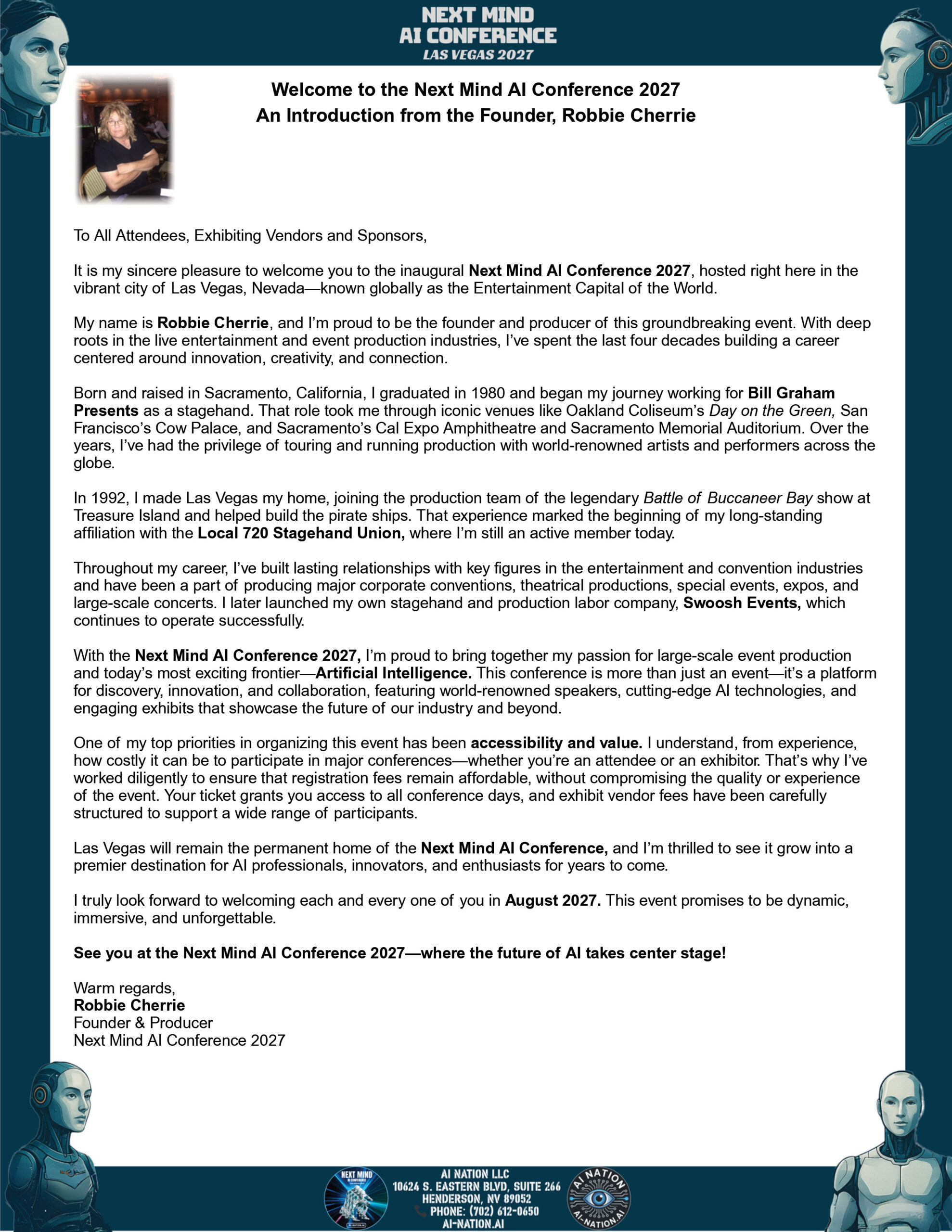 Taking place August 25–26, 2027 at the JW Marriott Las Vegas ~ The Resort at Summerlin, this groundbreaking event will bring together 500 to 1000 top innovators, leaders, and visionaries from across the globe. What sets Next Mind apart is its intentional scale and design: 41 curated booths, immersive demos, powerful showcases, thought-leading sessions, and an exclusive AI Networking Gala—all crafted to deliver a high-caliber, world-class experience. This is where breakthroughs ignite, partnerships spark, and the permanent global hub for AI innovation begins to take root. Unlike other conferences, Next Mind is built to grow exponentially year after year, quickly becoming the event everyone in the AI community will be talking about. Don’t miss your chance to be part of this historic gathering from the very beginning.